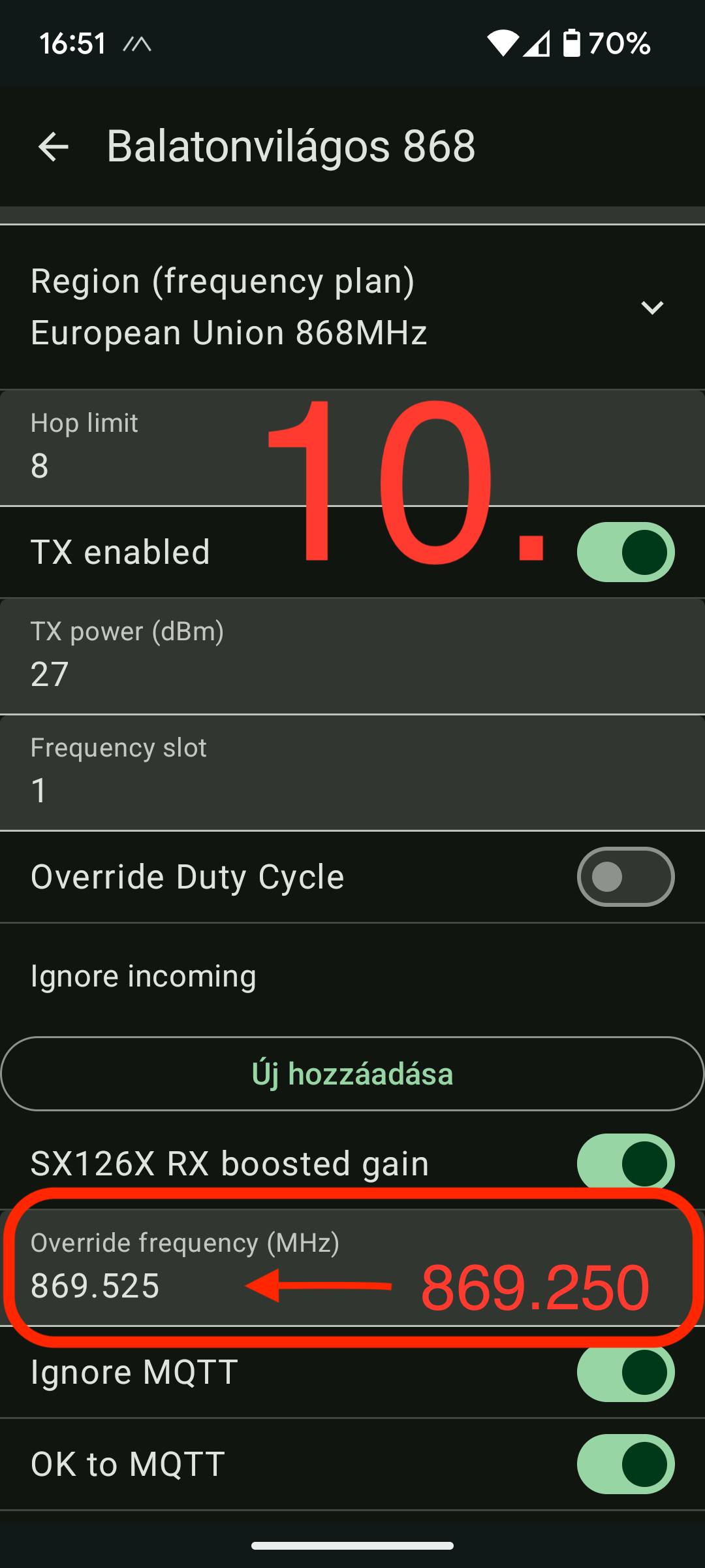 Kézenfekvő megoldás, hogy az alapértelmezett frekvencia felülírásával (10.) ábra kihasználhatjuk a LORA rádiónk hatótávolságának, adatátviteli képességeinek a zavartalan, fizikai határait. Frekvenciaváltás esetén, ha szabálykövető módon kívánunk rádiózni, akkor az adott sávrészben megengedett, kisebb teljesítményre állíthatjuk vissza a LORA rádiónkat a "TX power" mezőnél. Bár 433MHz-en csináltam ezt a kísérletet, de a Pilistető-i bázisállomás 10mW "megszólításra" 96Km távolságból, még stabilan válaszolt. Rendkívül sokat jelent a "csendes csatorna" és a minél jobb jel/zaj viszony biztosítása.