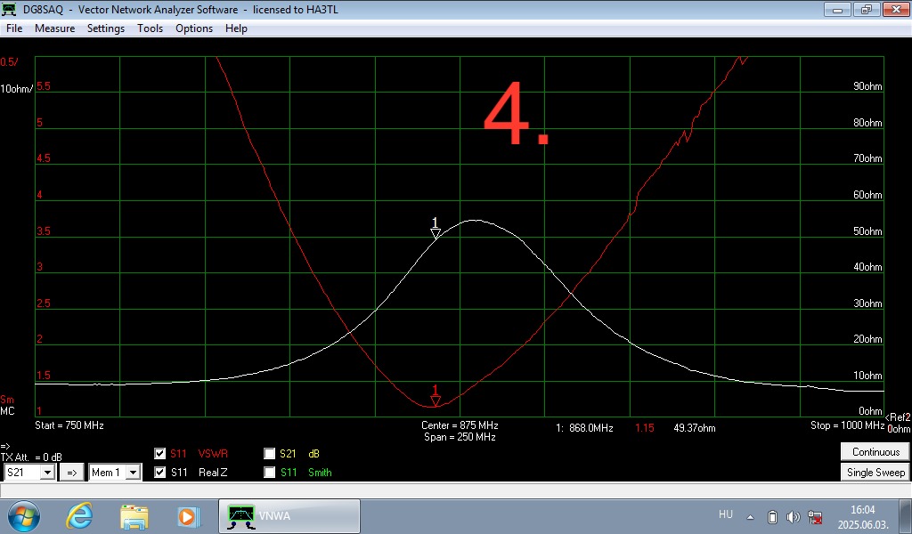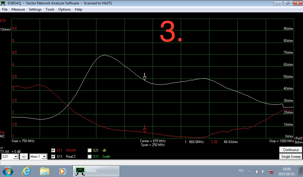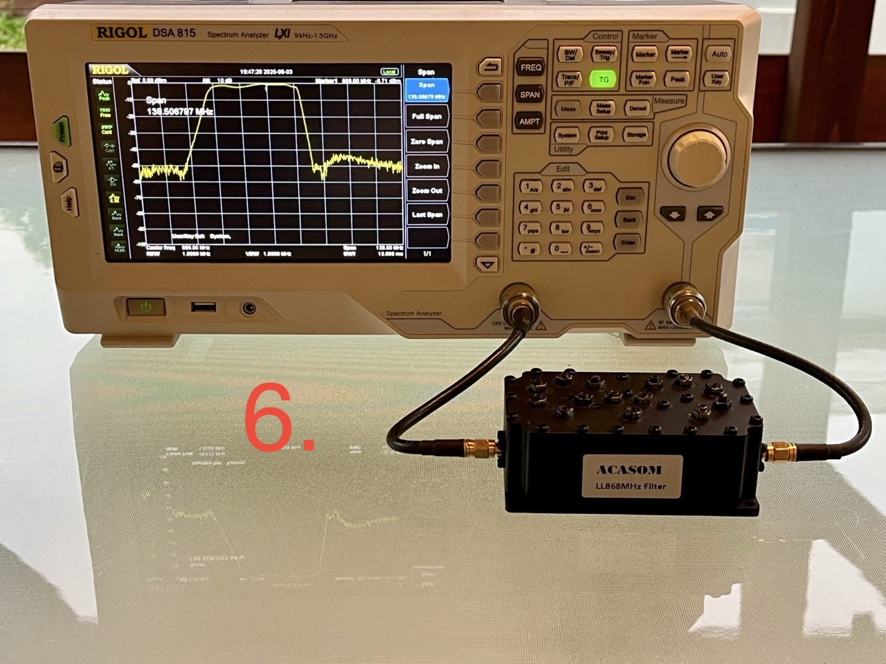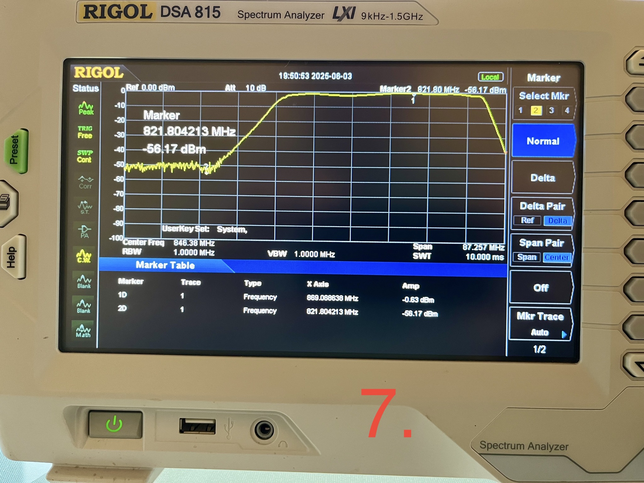 Talajszinten működtetett, hordozható, vagy mobil állomások "arasznyi" antennával még nem igénylik, de stabil, vagy bázis állomások esetén nagyobb magasságban, kollineár antennával mindenképp alkalmazzunk jó minőségű sávszűrőt! Az olcsó, kis méretű SAW szűrőkről most nem beszélek, mert gyakorlatilag nem hoznak annyi "hasznot" a konyhára, mint amekkora veszteséget okoznak a beiktatási csillapításuk és a nem kívánt frekvenciák gyengébb elnyomása miatt. A sávszűrők mérésénél (6.) ábra általában elégedetten hátradőlünk, ha 1dB vagy az alatti beiktatási csillapítást látunk a használni kívánt frekvencián. Viszont van még egy nagyon fontos tulajdonság, a nem kívánt frekvenciák csillapítása, ami legalább ugyanilyen fontos. Ezért ne csak beiktatási csillapítást mérjünk 868MHz-en, hanem elnyomást is 821MHz-en és 925MHz-en úgyszintén.