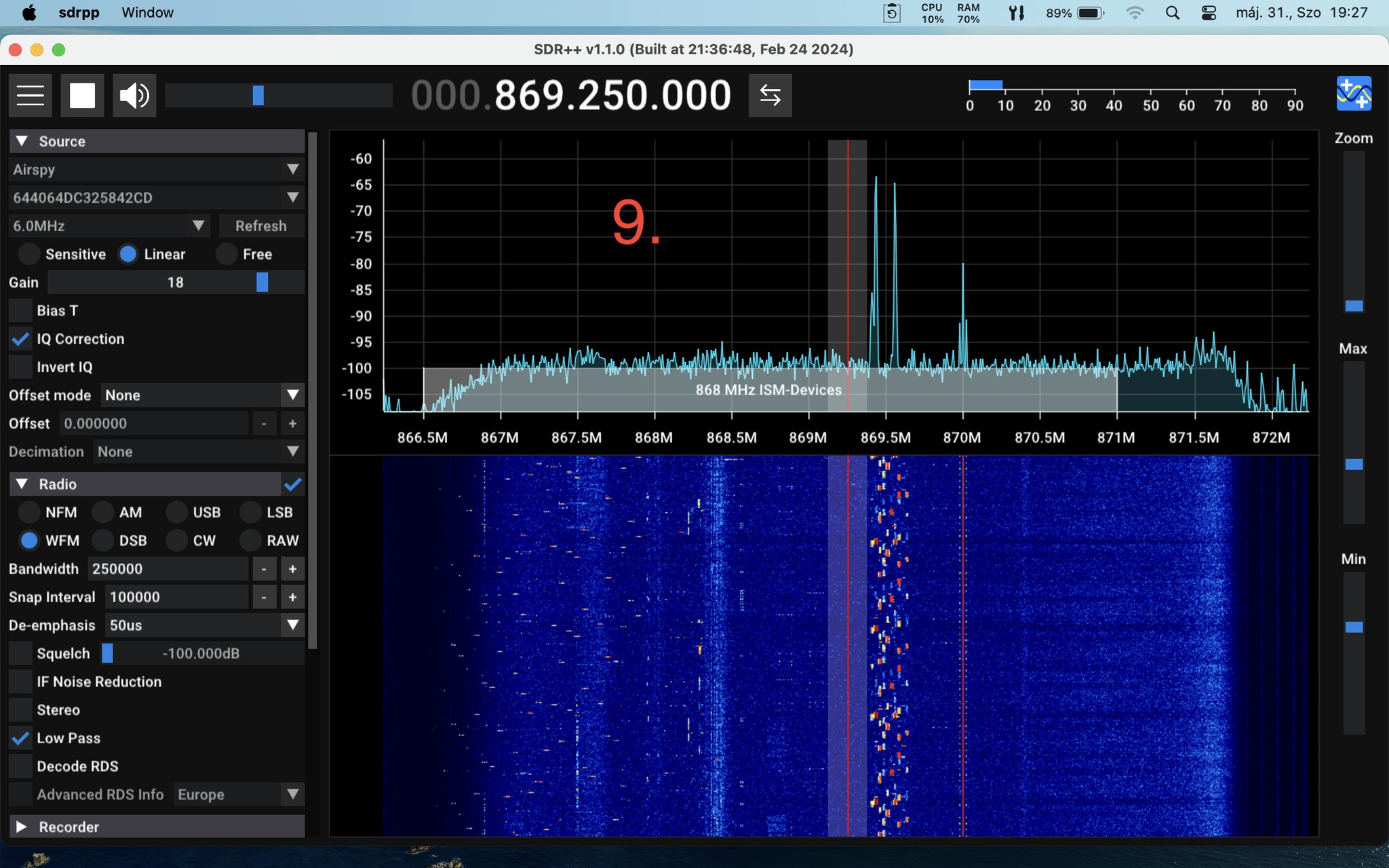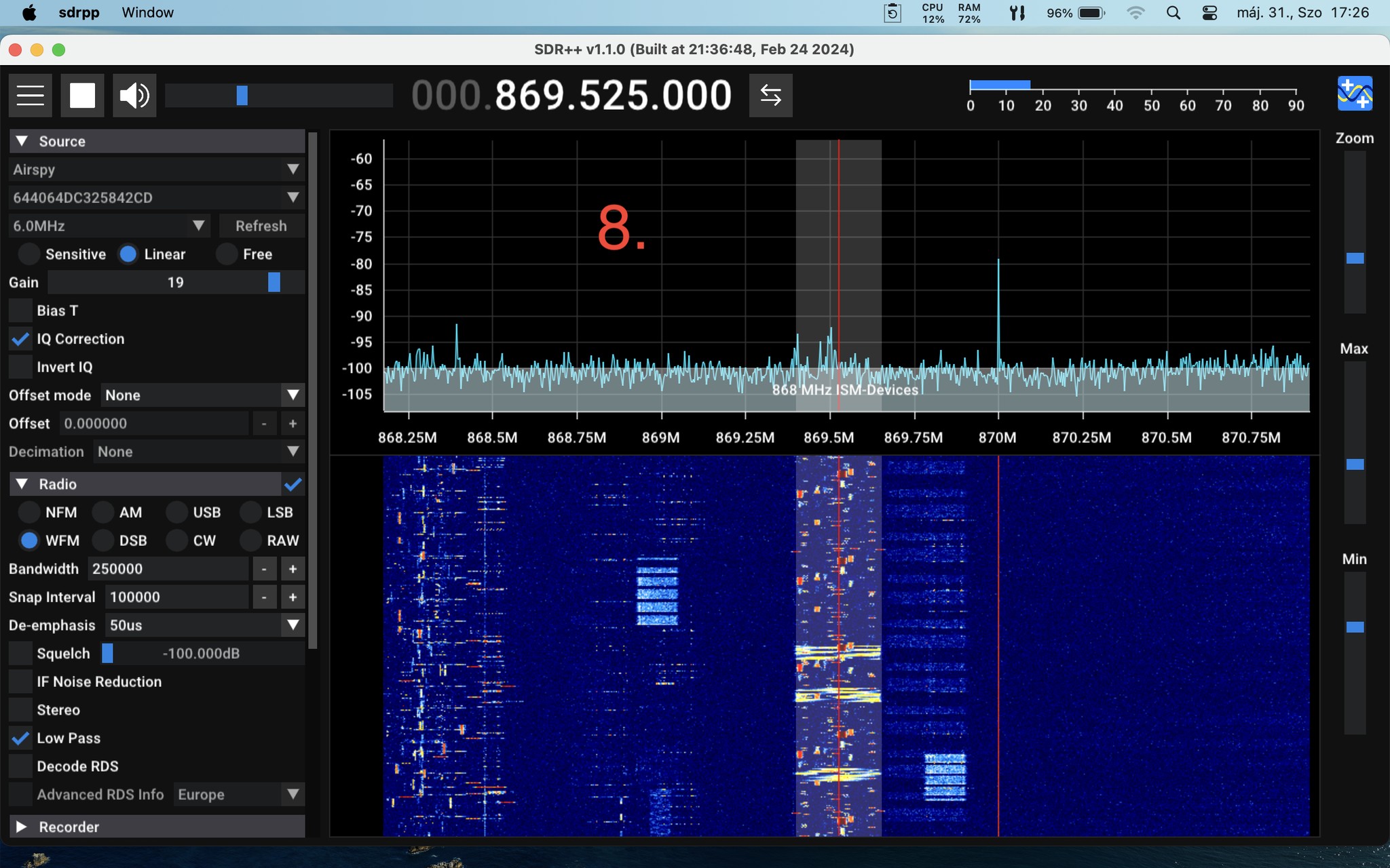 A végére hagytam a Magyarország-specifikus bónuszt, a használt frekvencia kérdését. A Meshtastic eszközöd beállításakor, amikor kiválasztod az "EU-868" beállítást, a készüléked az alapértelmezett 869.525 MHz-es frekvenciára kerül. Lényegében ez a közepe az adatfolyamhoz használt 250KHz szélességű "csatornának". Miért pont ide tesz? Elsősorban azért, mert ebben a tartományban megengedett Európa-szerte az 500mW ERP teljesítmény, valamint a 10%-os adásidő kitöltés. Ezt meglovagolva költséghatékony megoldásként (dehogy bérelnek ők külön frekvenciát) ide telepedett számos LoraWAN céges szolgáltató. Sajnos ezek a jellemzően országszerte magas helyekre, műsorszóró adók, reléállomások alá telepített LoraWAN állomások folyamatosan tolják a "szemetet" hajszál pontosan a Meshtastic alapértelmezett csatornánkra. A (8.) ábrán egy Fót-on készült SDR felvétel látható. A világos szürke sáv az alapértelmezett 250KHz széles Mesh csatorna. A három sárga csík Meshtastic eszköz kommunikáció, a mérhetetlen sok apró pirosas színű szemét pedig a LoraWAN állomások terméke.